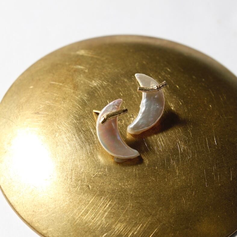 バラの枝をかたどったピアスバーに、月のかたちを宿した淡水パールを重ねて。